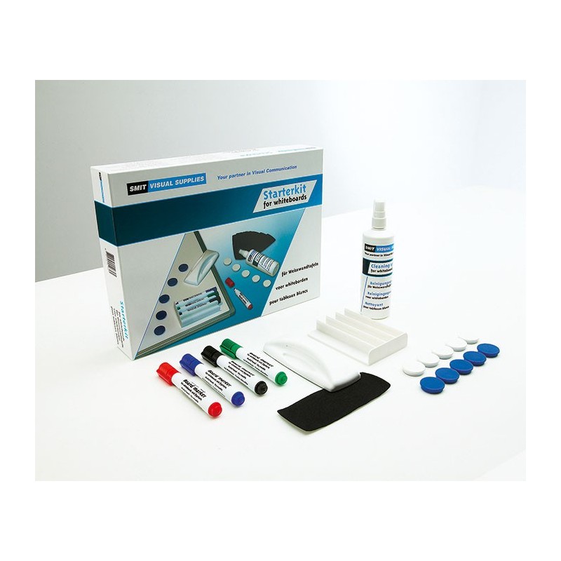 Contine: 4 markere pentru tabla (negru, rosu, verde si albastru), 1 suport magnetic pentru 4 markere,10 magneti diametru 30 mm ,1 burete magnetic ,1 spray curatare table,10 rezerve burete pasla.
