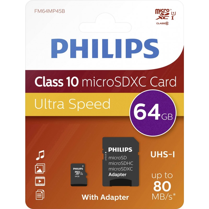 Card memorie Micro SDXC, cu adaptor SD, clasa 10, PHILIPS - 64GB