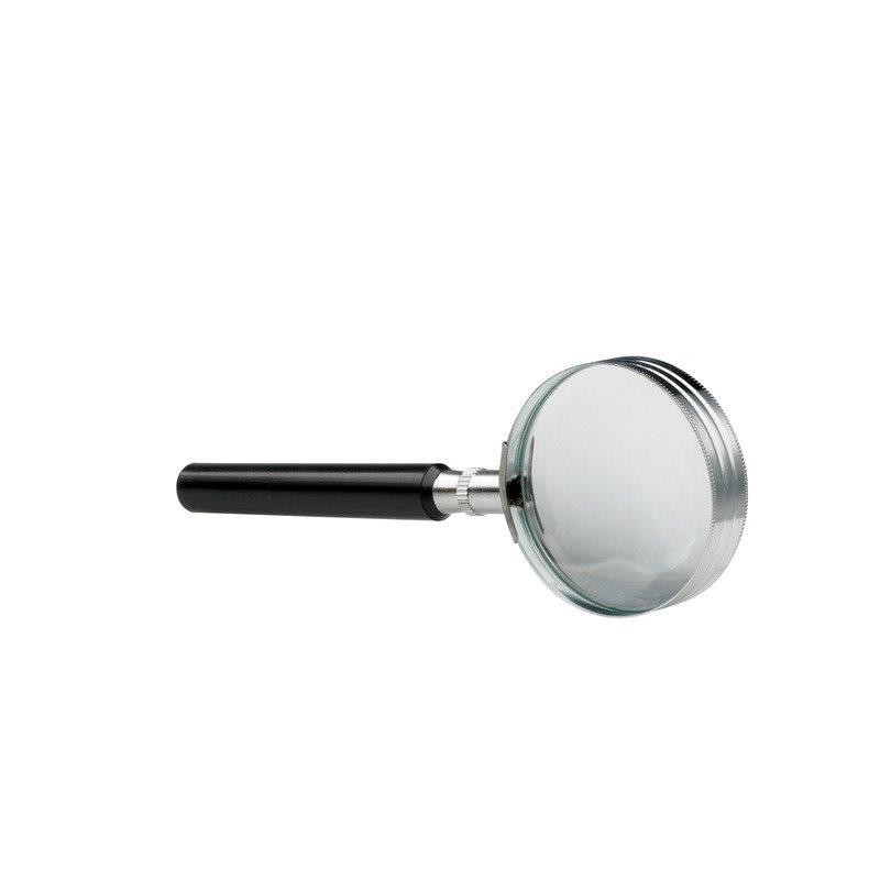 Lentila din sticla, cu rama si maner negru din plastic.