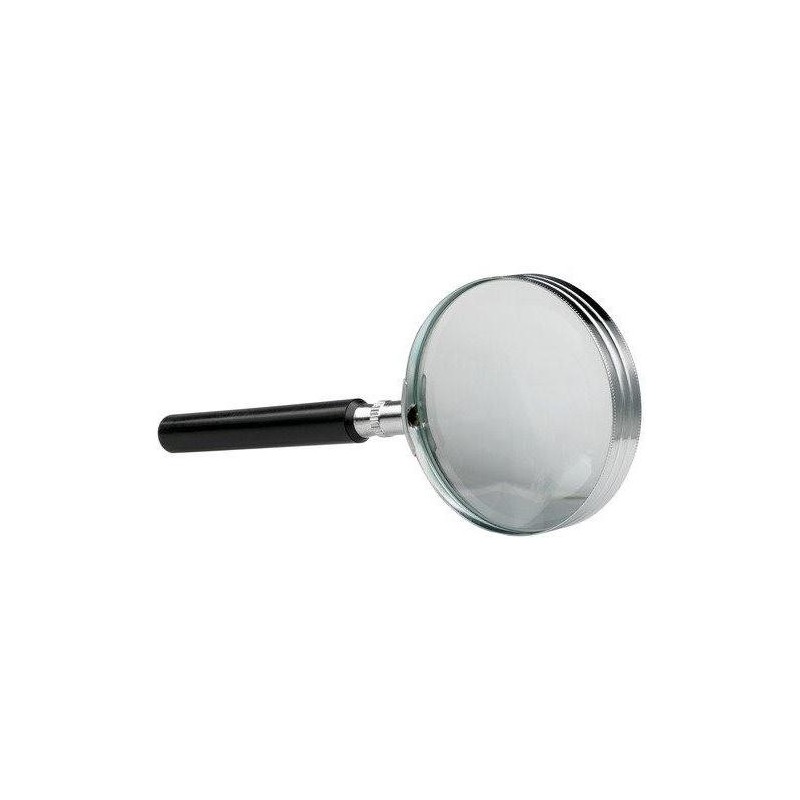 Lentila din sticla, cu rama si maner negru din plastic.
