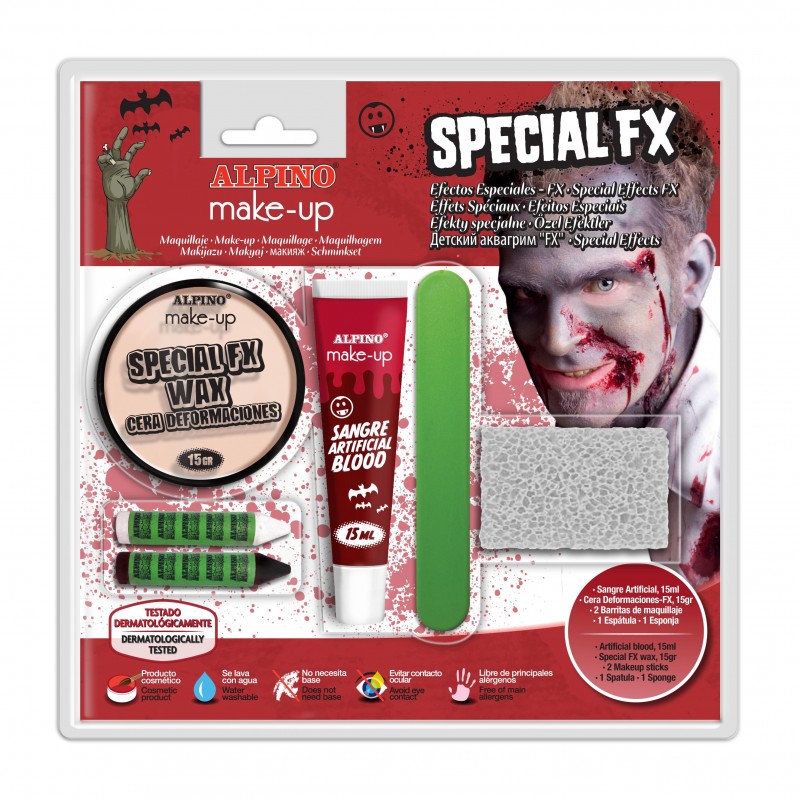 Kitul contine: ceara speciala 15gr., 15 ml sange artificial, stick de machiaj alb 5gr, stick de machiaj negru 5gr, 1 spatula, 1 buretel.